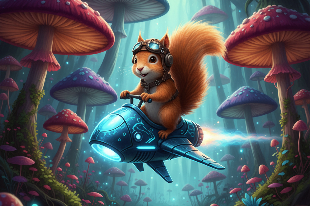 Beispiel-Prompt: Ein flauschiges Eichhörnchen, das ein leuchtend blaues Raumschiff in einem Wald voller riesiger Pilze steuert, digital art, hochdetailliert.