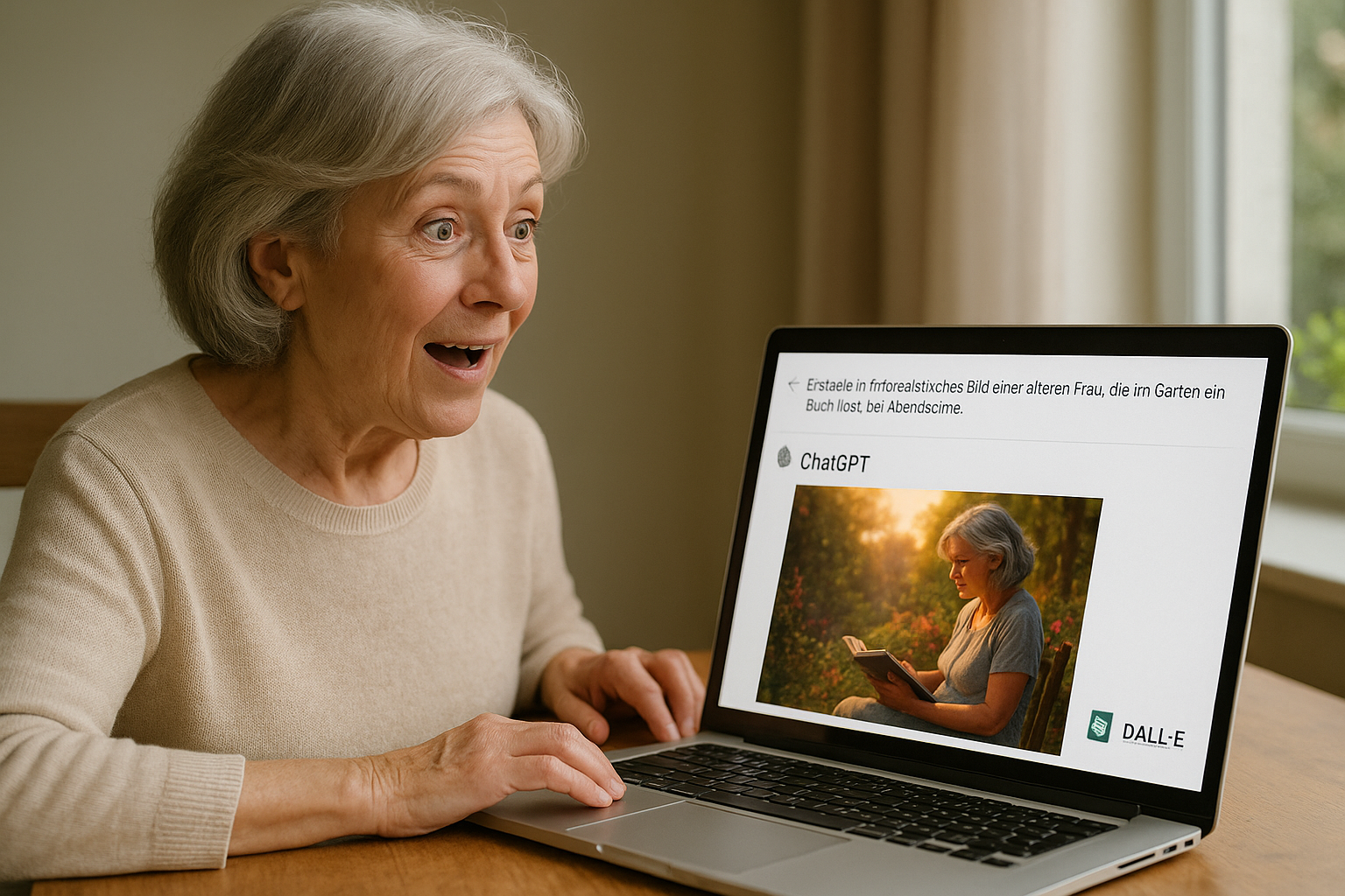 „z. B. ältere Frau am Laptop, die staunend ein KI-Bild betrachtet“